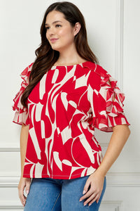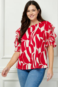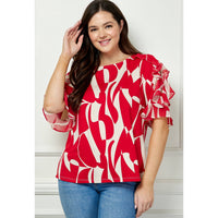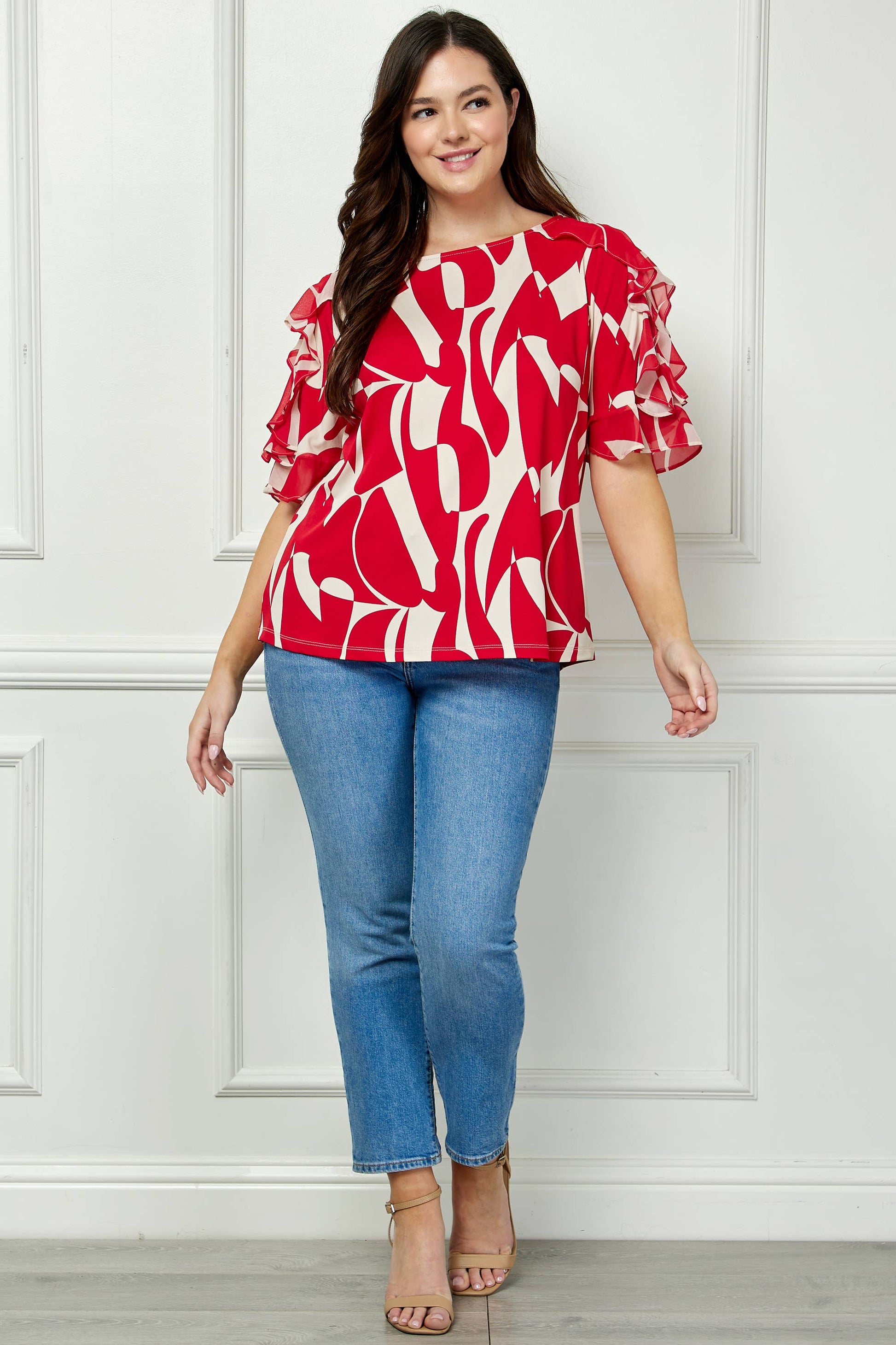 Plus Size Wildly Abstract Boatneck Top with Ruffle Sleeves